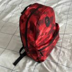 Streetwear Icon: Features the legendary all-over Bape Camo pattern in a striking red colorway. A rubberized "Ape Head" logo patch is centrally placed on the front.