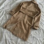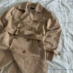 • Design: Classic double-breasted silhouette with tortoiseshell-effect buttons. Includes a belted waist with a buckle, adjustable cuff straps, and shoulder epaulettes.